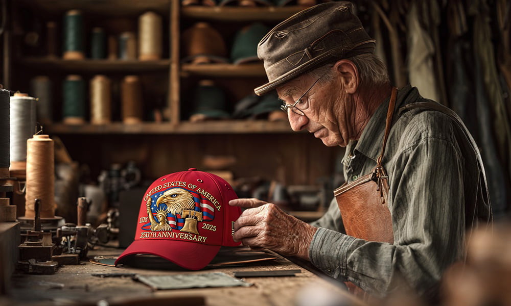 Each cap is handcrafted by skilled artisans in a veteran-owned workshop, with stunning attention to detail and iconic symbols that tell America's story.